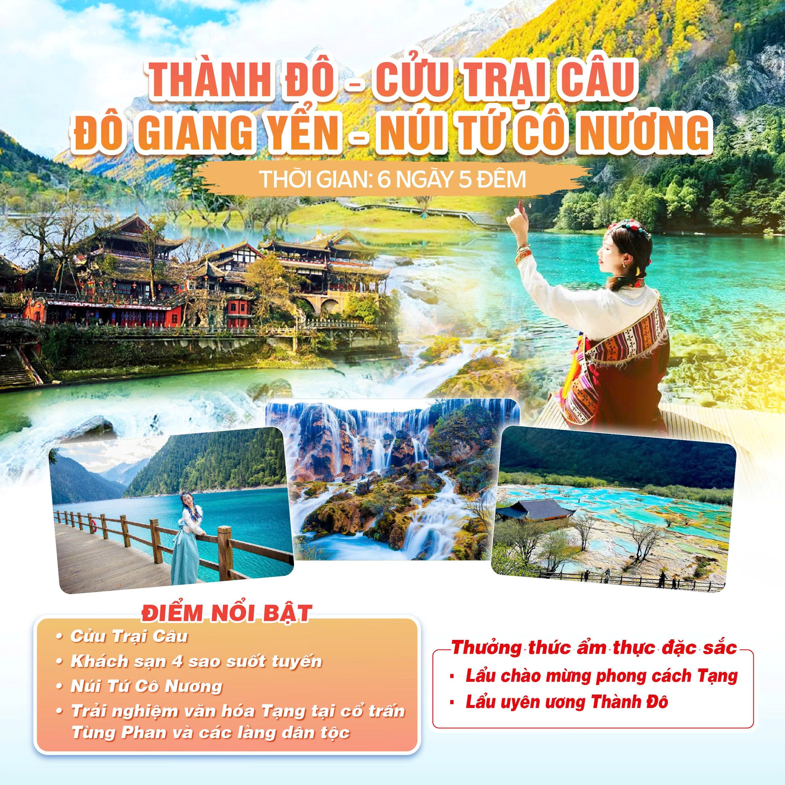 - Xe đưa quý khách đi tham quan thắng cảnh Thiên Đường Cửu Trại Câu - Thiên đường hạ giới thứ 2 (bao gồm xe điện) – Trong tiếng Tây Tạng, Cửu Trại Câu là Sicadêgu có nghĩa là "Thung lũng chín làng” được người dân Trung Quốc mệnh danh là "Vua của các cảnh quan nước" vì có hồ trên núi, những con thác cao, khu rừng cổ thụ đầy màu sắc, đỉnh núi tuyết trắng xóa và phong tục truyền thống đặc biệt của người Tây Tạng.
